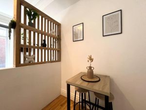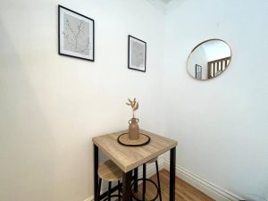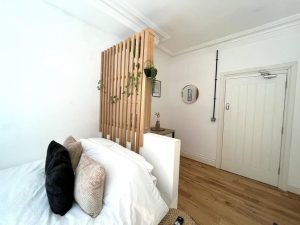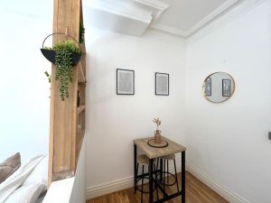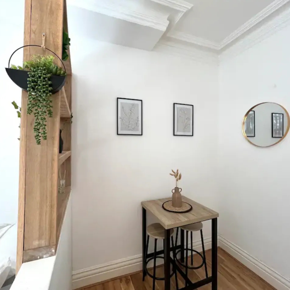 This studio flat benefits from high ceilings and large windows, offering a bright and airy feel.